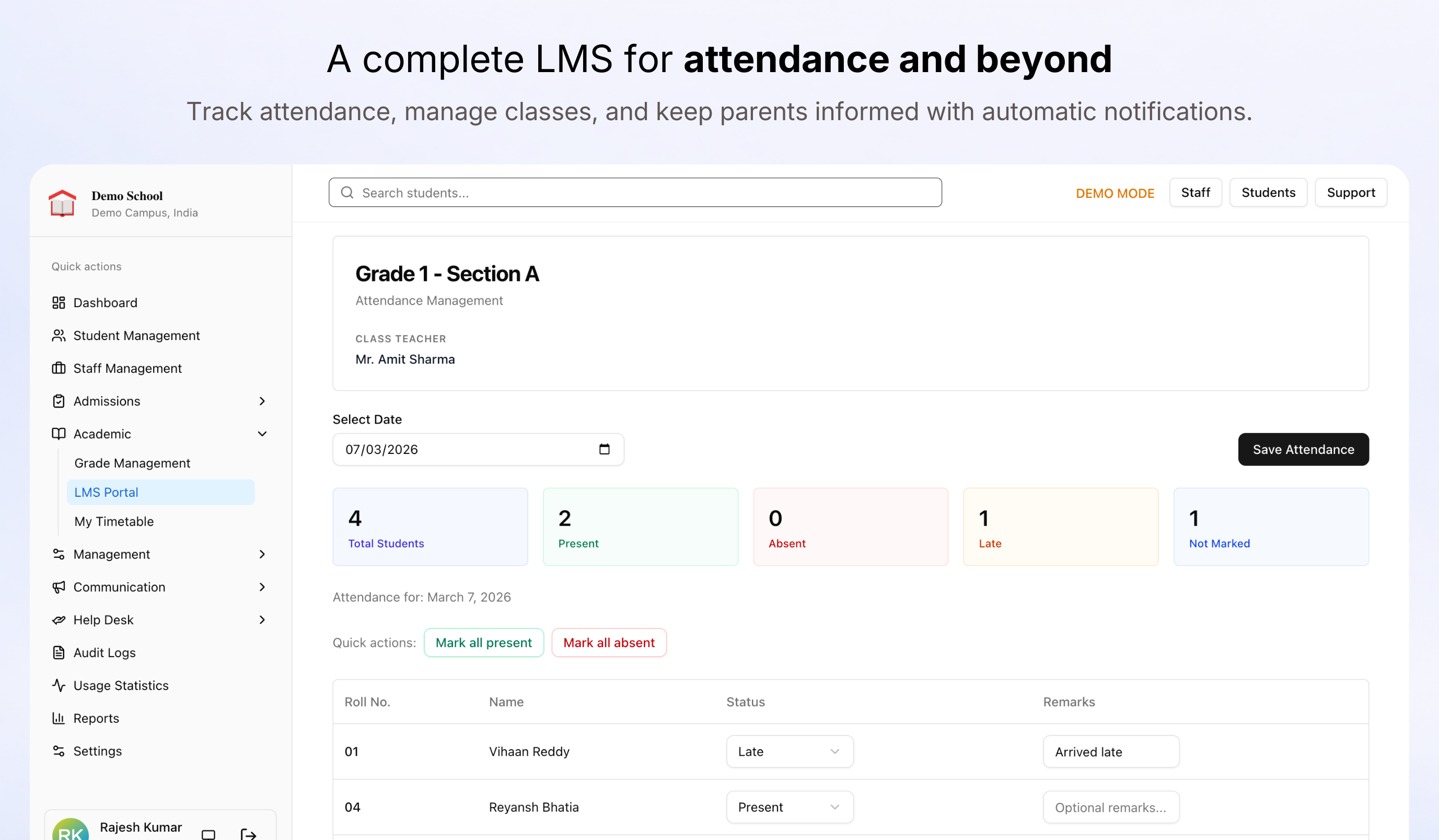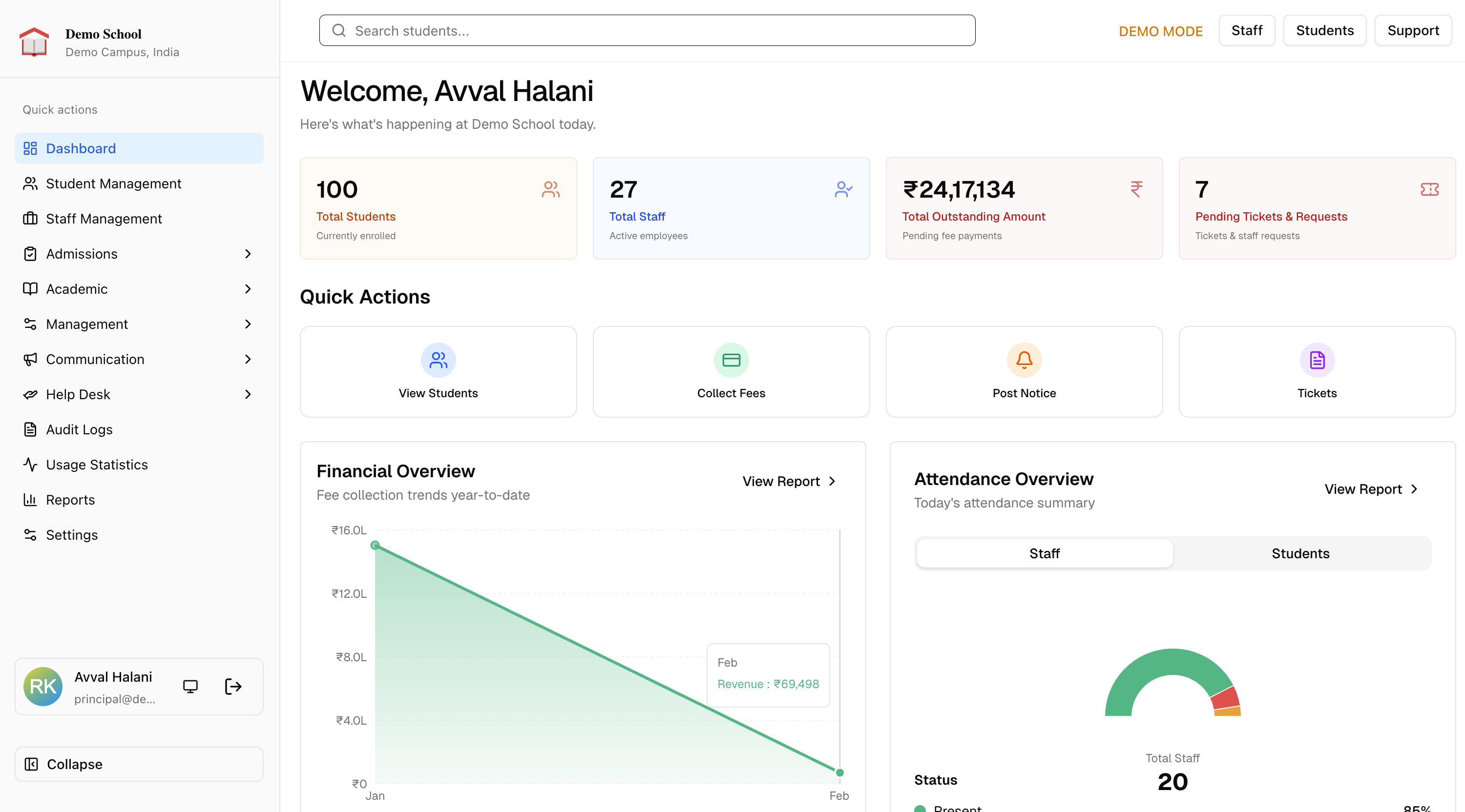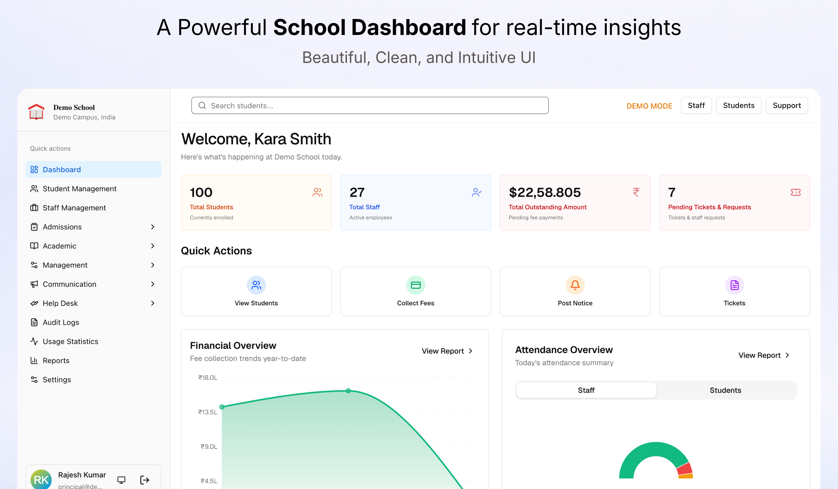 Handle staff, students, fees, admissions, academics, and more from a single dashboard. No more switching between tools.