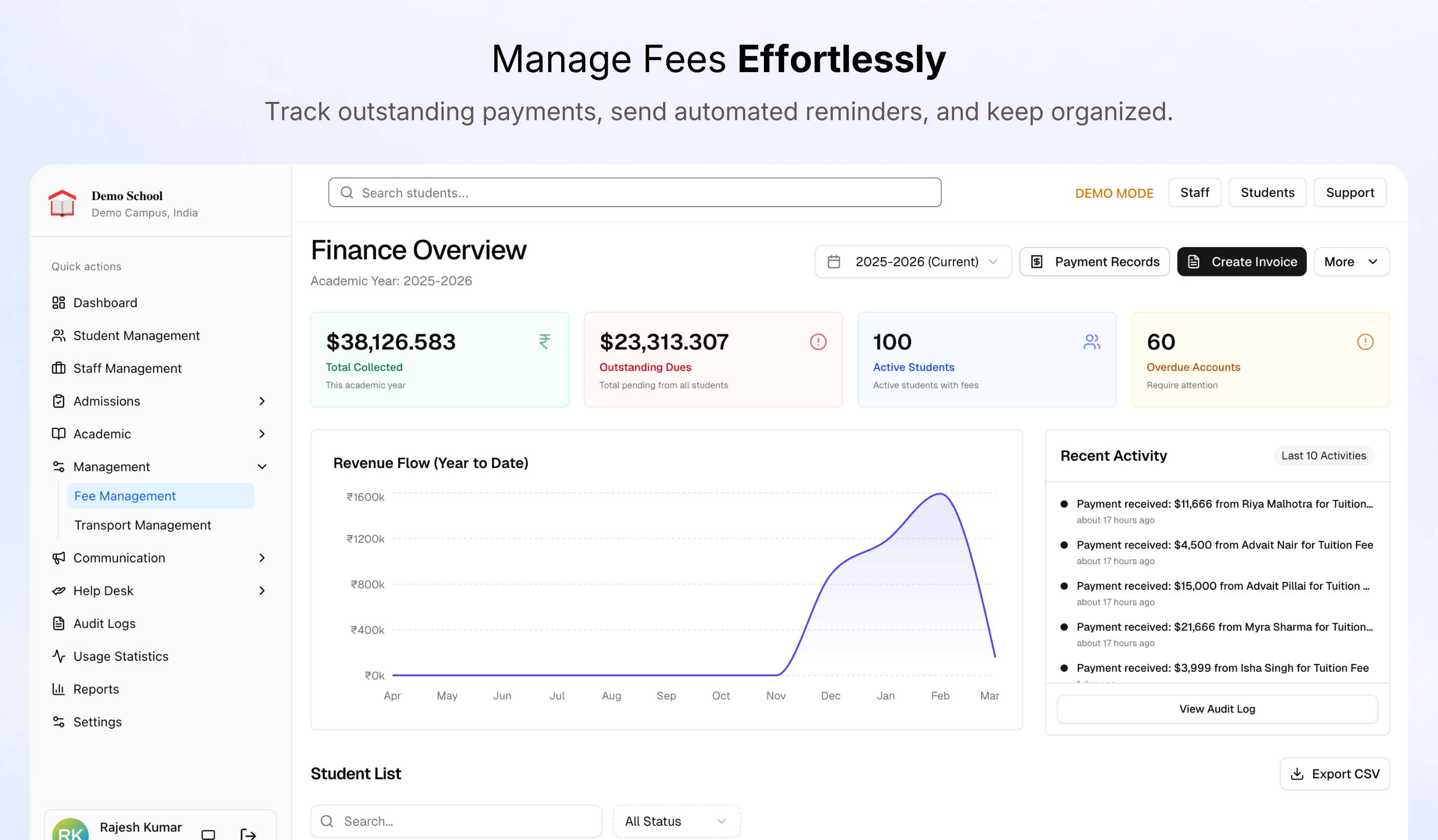 Track fee collections, outstanding dues, invoices, reminders, and discounts by academic year.