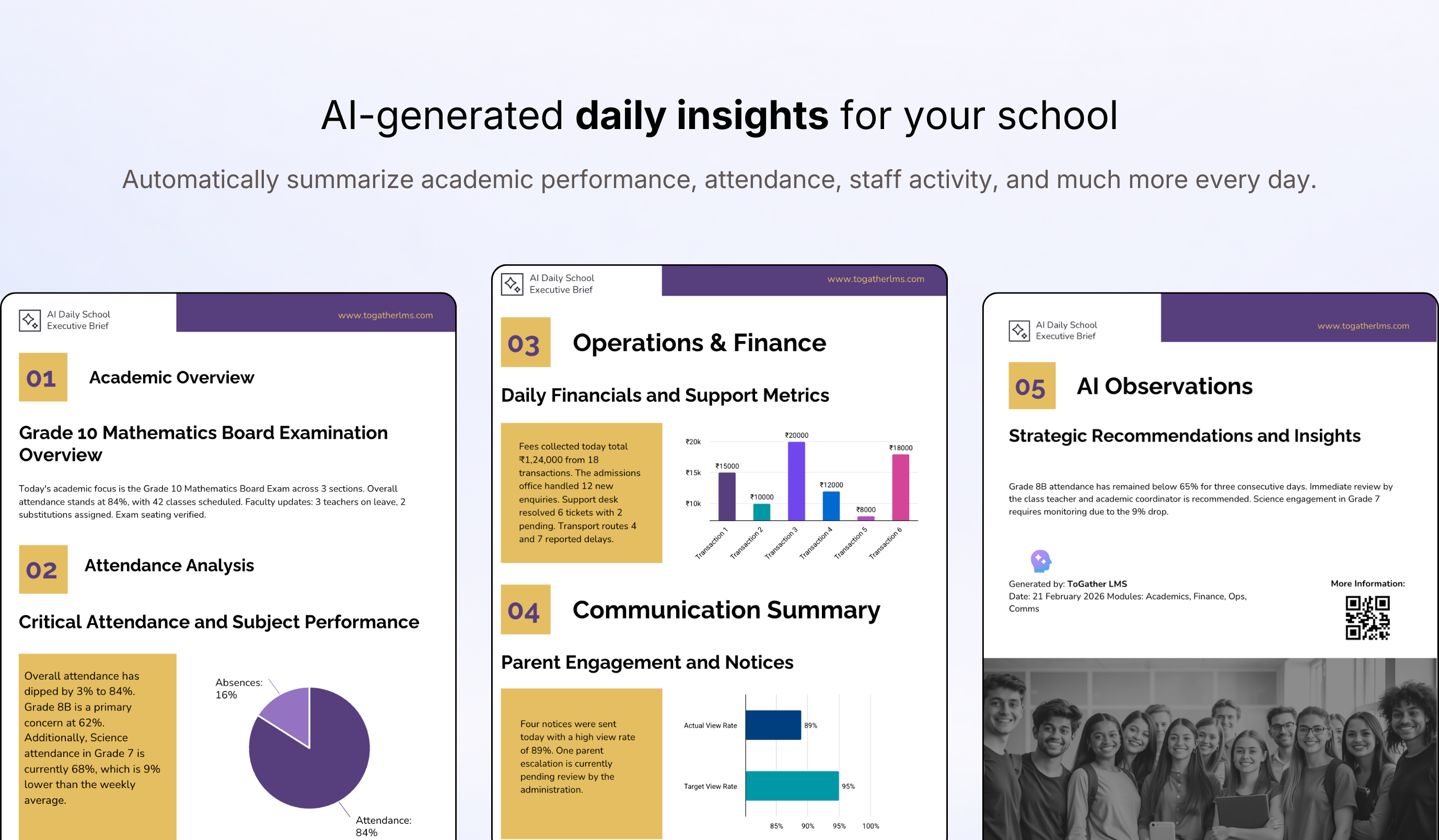 Google Classroom handles teaching well, but schools run on a lot more than assignments. See how ToGather brings fees, admissions, attendance, transport, and academics into one unified dashboard so you can stop juggling multiple tools.
